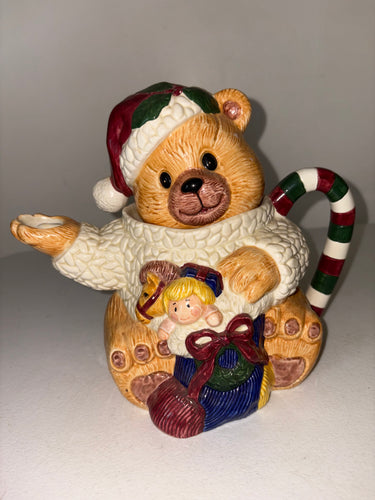 Christmas Teddy Bear Teapot w/Tree & Gifts Holiday Ceramic Hand Painted 1996