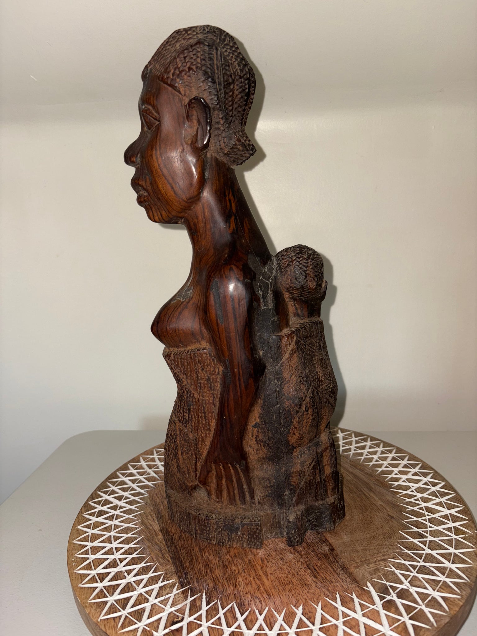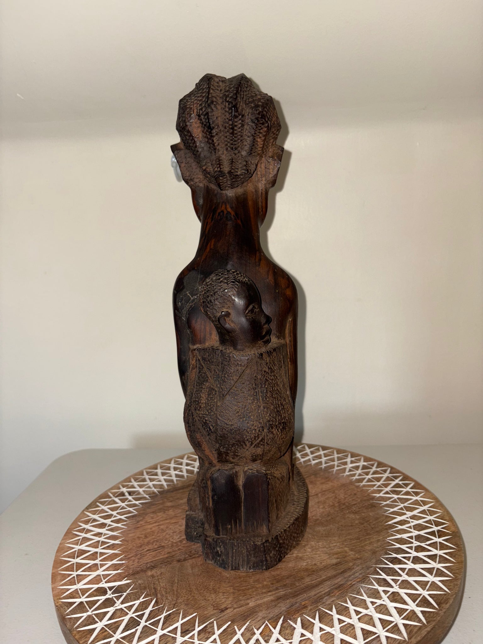 This 1950's Wood Carving African Woman with Baby is a stunning piece of craftsmanship. Hand carved from mahogany, it showcases the beauty of African art. Its versatile design can also be turned into a lamp, adding functionality to its aesthetic appeal. A must-have for any collector or lover of African culture. Measures approximately 16 inches tall. Heavy!!