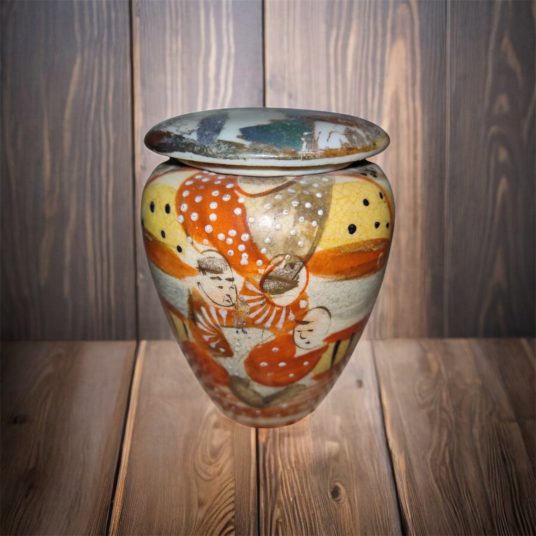 Antique Japanese Satsuma Covered Vase. Excellent condition all hand painted. No chips or cracks. Stamped Japan on lid. Well detailed and vibrant colors. Measures approximately 4 1/2 inches tall