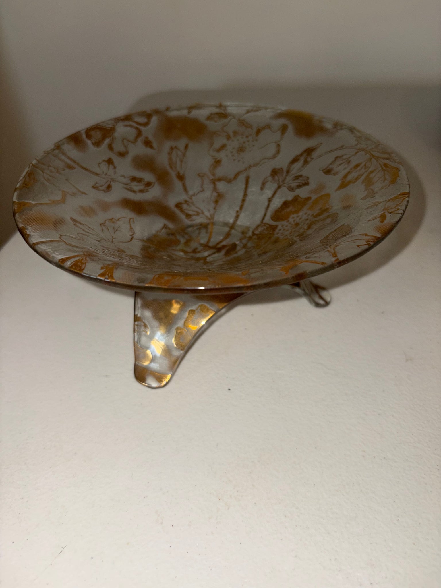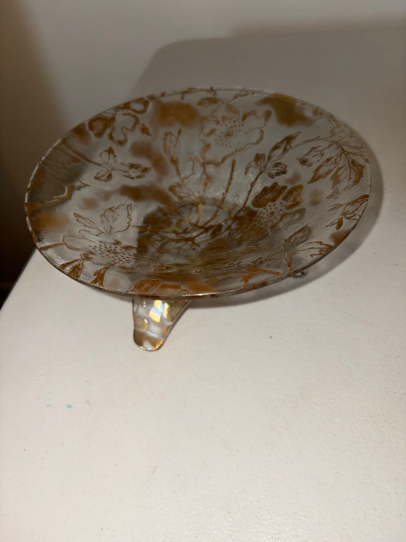 Crafted with vintage elegance, the Gold Leaf Candy Compote adds a touch of glamour to any table setting. Its intricate gold leaf design exudes sophistication while offering a timeless appeal. Perfect for displaying candies or other treats, this compote elevates any event or occasion with its classic charm.