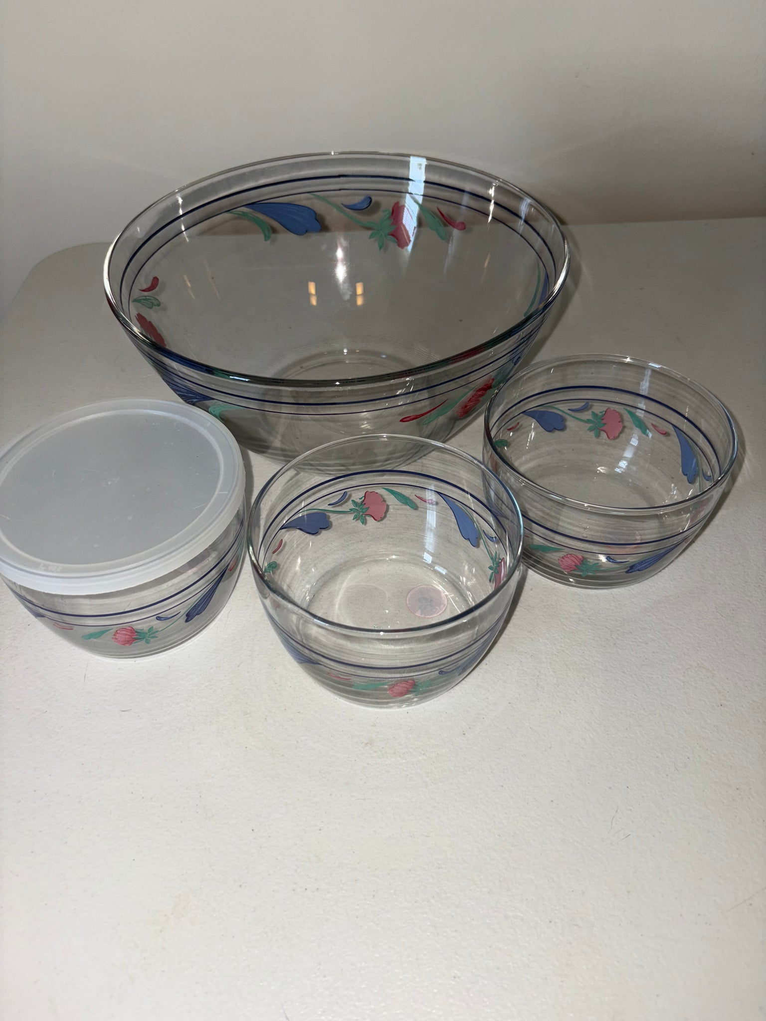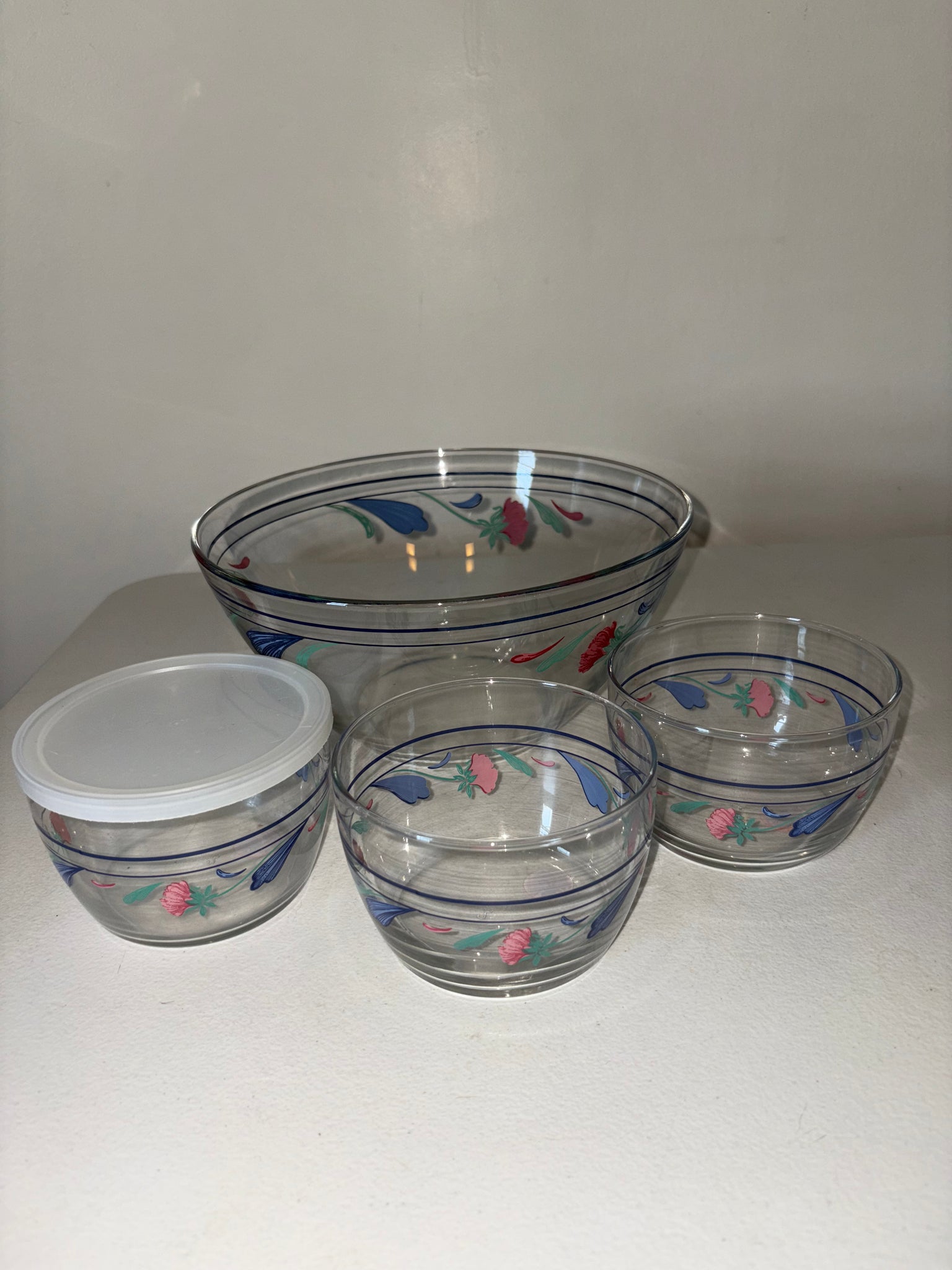 The Lenox Glassware Poppies on Blue All Purpose Bowl is a set of three, with a large bowl measuring 9 inches and a small measuring 4 inches. In excellent condition with no chips or cracks, this bowl features vibrant red flowers and blue leaves, adding a touch of elegance to any table setting.