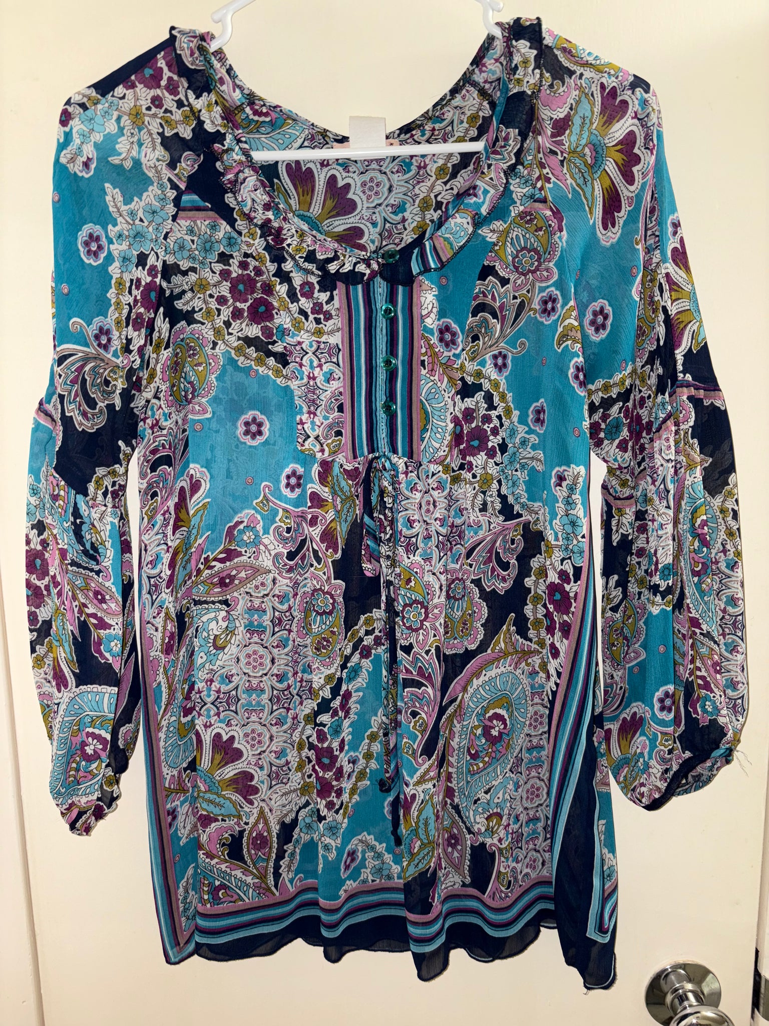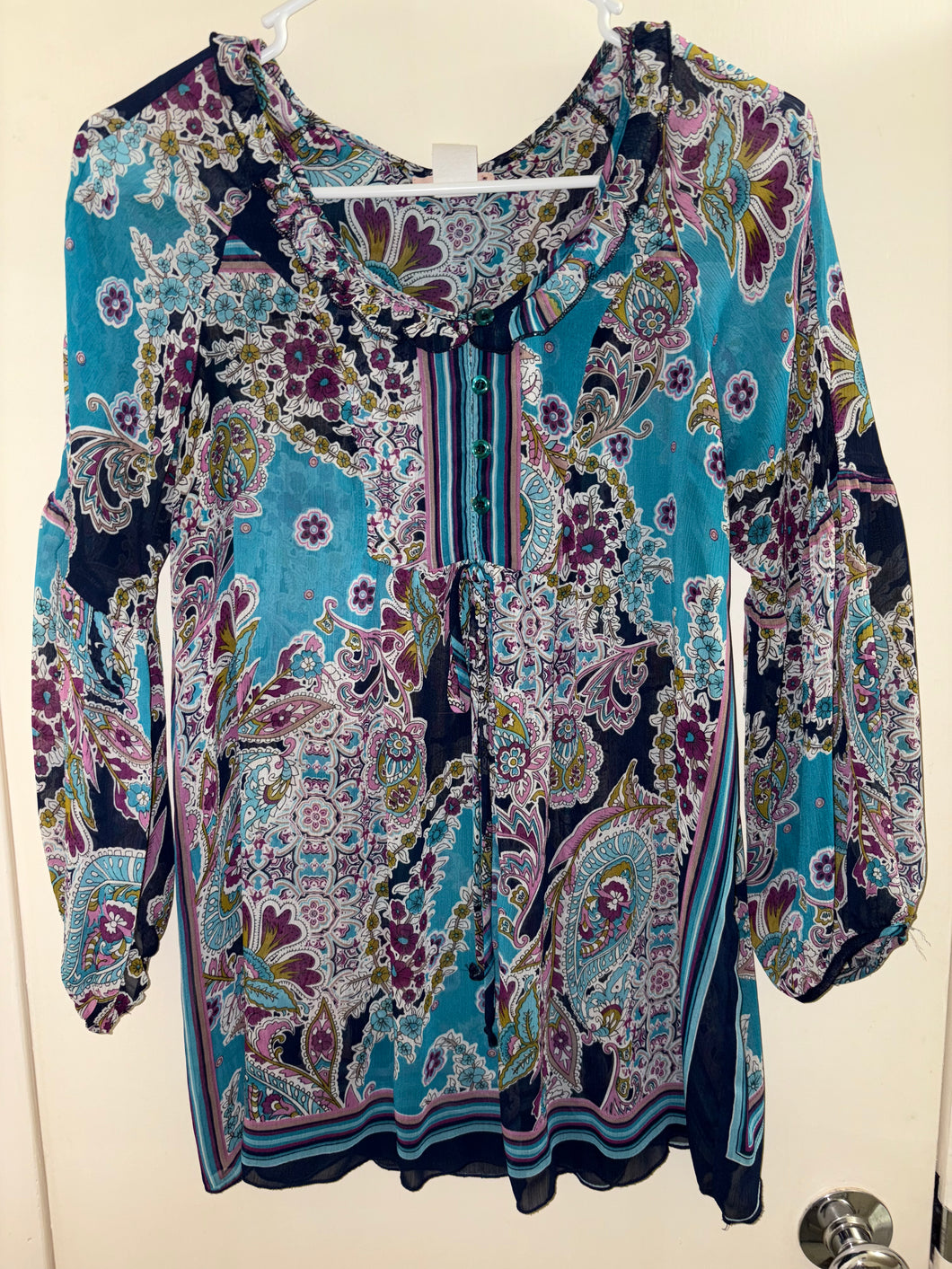 Expertly designed for comfort and style, the Luna Chix Blouse boasts a colorful blue, purple, and black paisley print. The boho-inspired peasant style features 3/4 sleeves and a flattering pleated design. Perfect for any occasion, this blouse is sure to elevate your wardrobe. This blouse is semi share