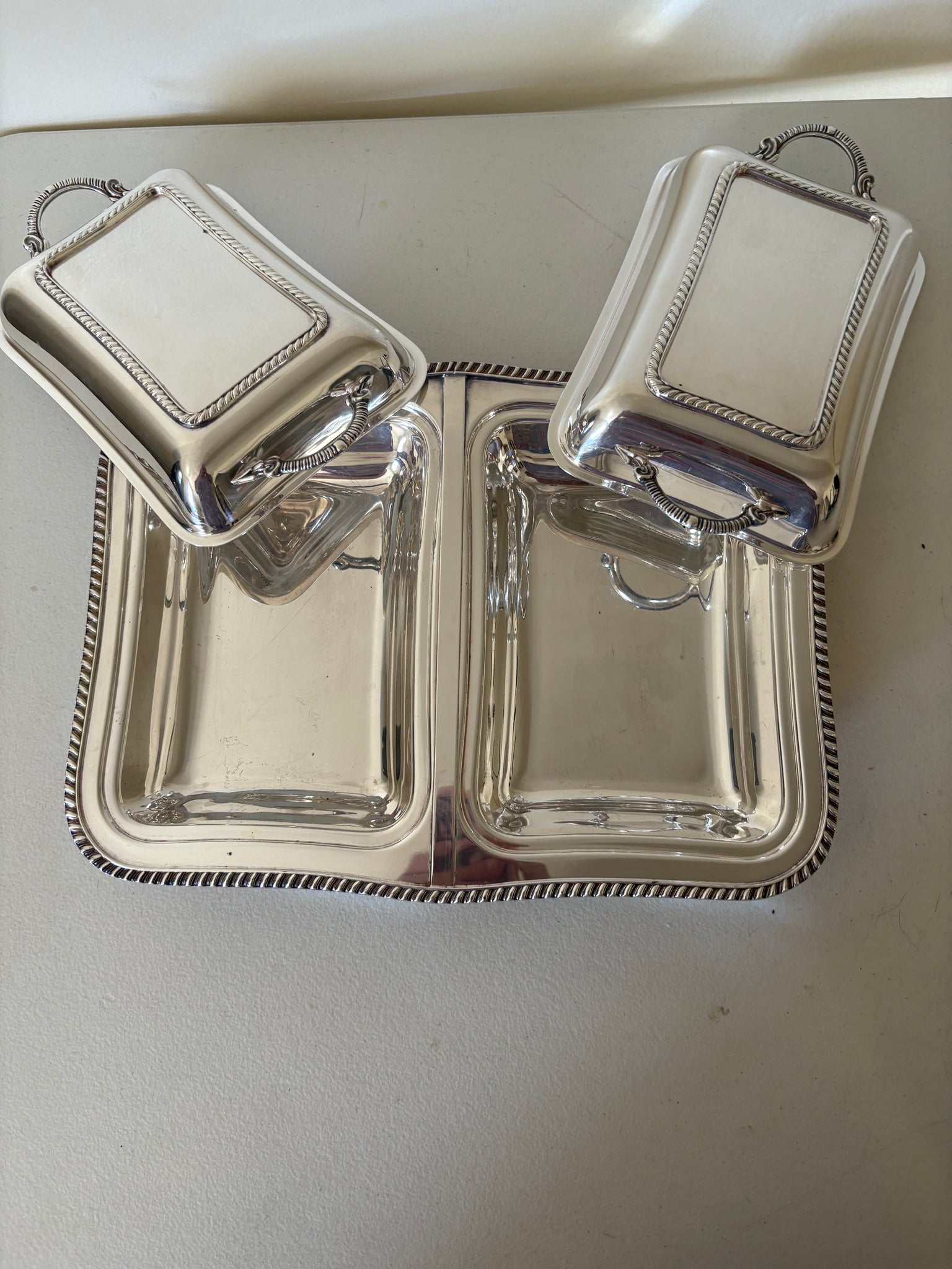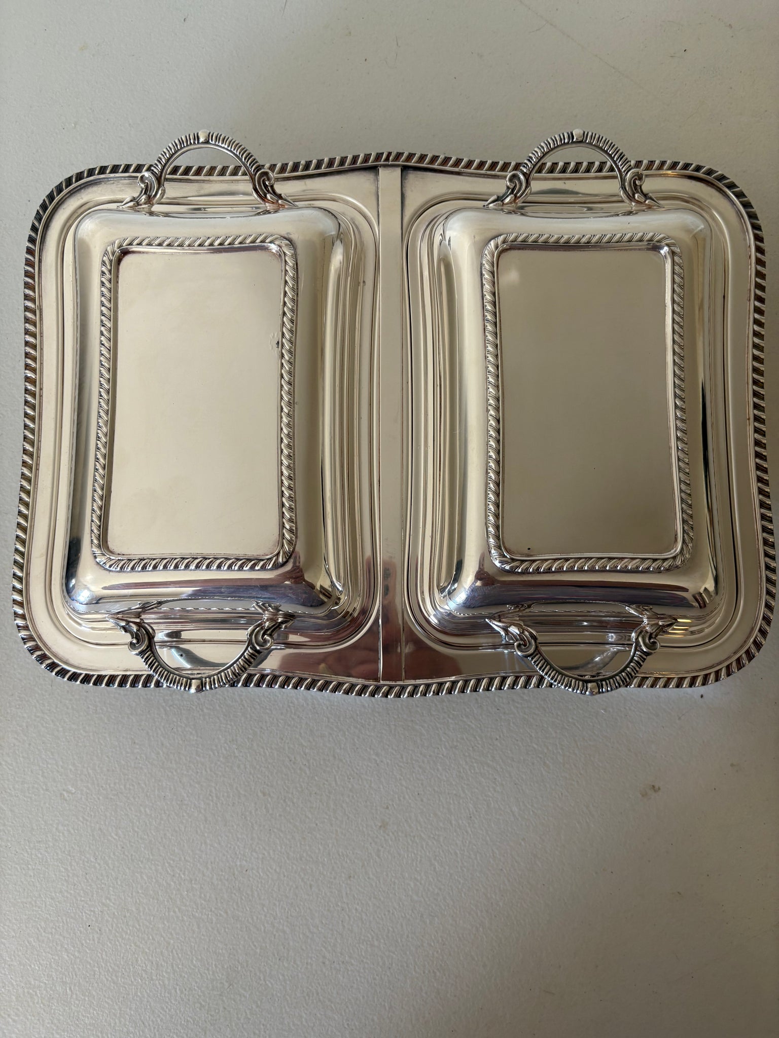 Expertly crafted with vintage elegance, the Vintage Silver Plate Double Server adds a touch of sophistication to any table setting. The crescent design, measuring 13x12, is signed for authenticity. Serve up style and charm with this timeless piece.