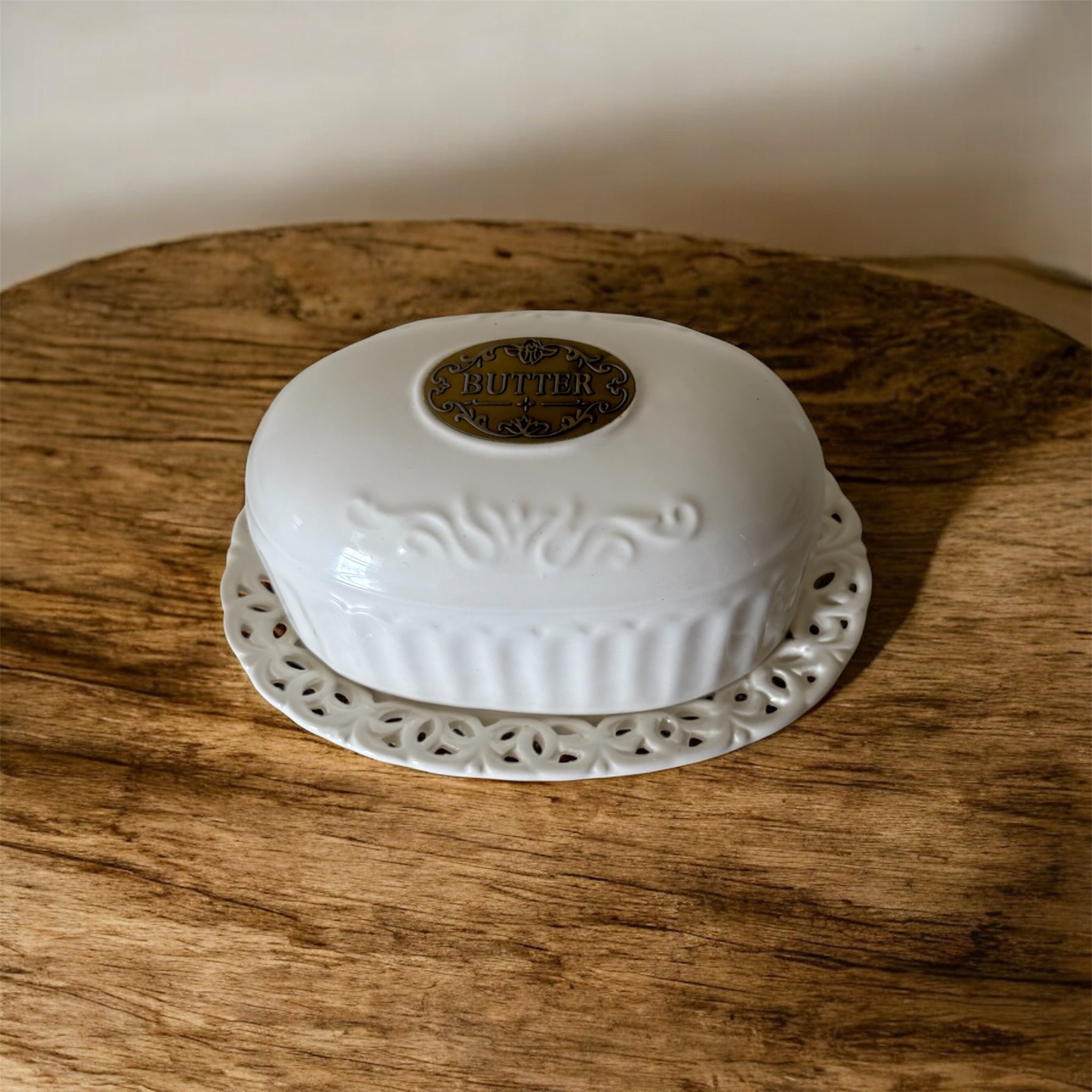 This classic French Cottage butter dish features a vintage THL design and a bronze badge with a lace edge. Perfect for adding a touch of nostalgia and elegance to any table setting. Crafted from high-quality materials for long-lasting use. Elevate your dining experience with this charming butter dish.